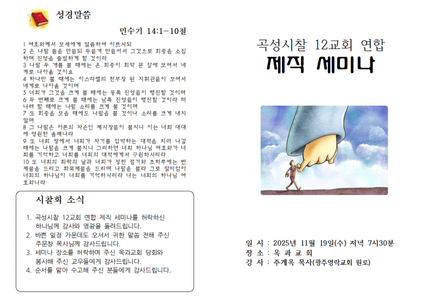 공지 | 11.20 제직 세미나 페이지 정보 작성자 최고관리자 작성일25-11-22 18:37 조회128회 댓글0건 관련링크 이전글 다음글 목록 글쓰기 본문 * SNS공유 댓글목록 등록된 댓글이 없습니다. 이전글 다음글 목록 글쓰기