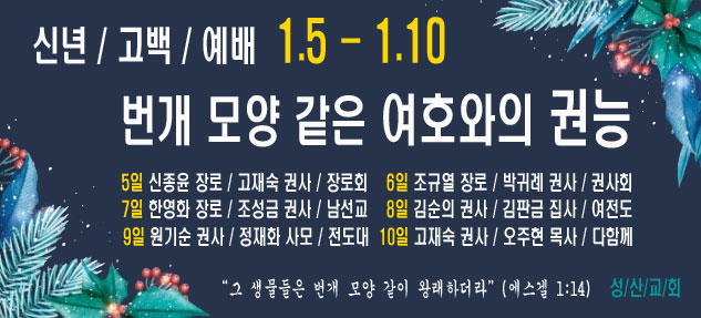 공지 | 신년 고백 예배 페이지 정보 작성자 최고관리자 작성일26-01-03 16:35 조회284회 댓글0건 관련링크 이전글 다음글 목록 글쓰기 본문 * SNS공유 댓글목록 등록된 댓글이 없습니다. 이전글 다음글 목록 글쓰기